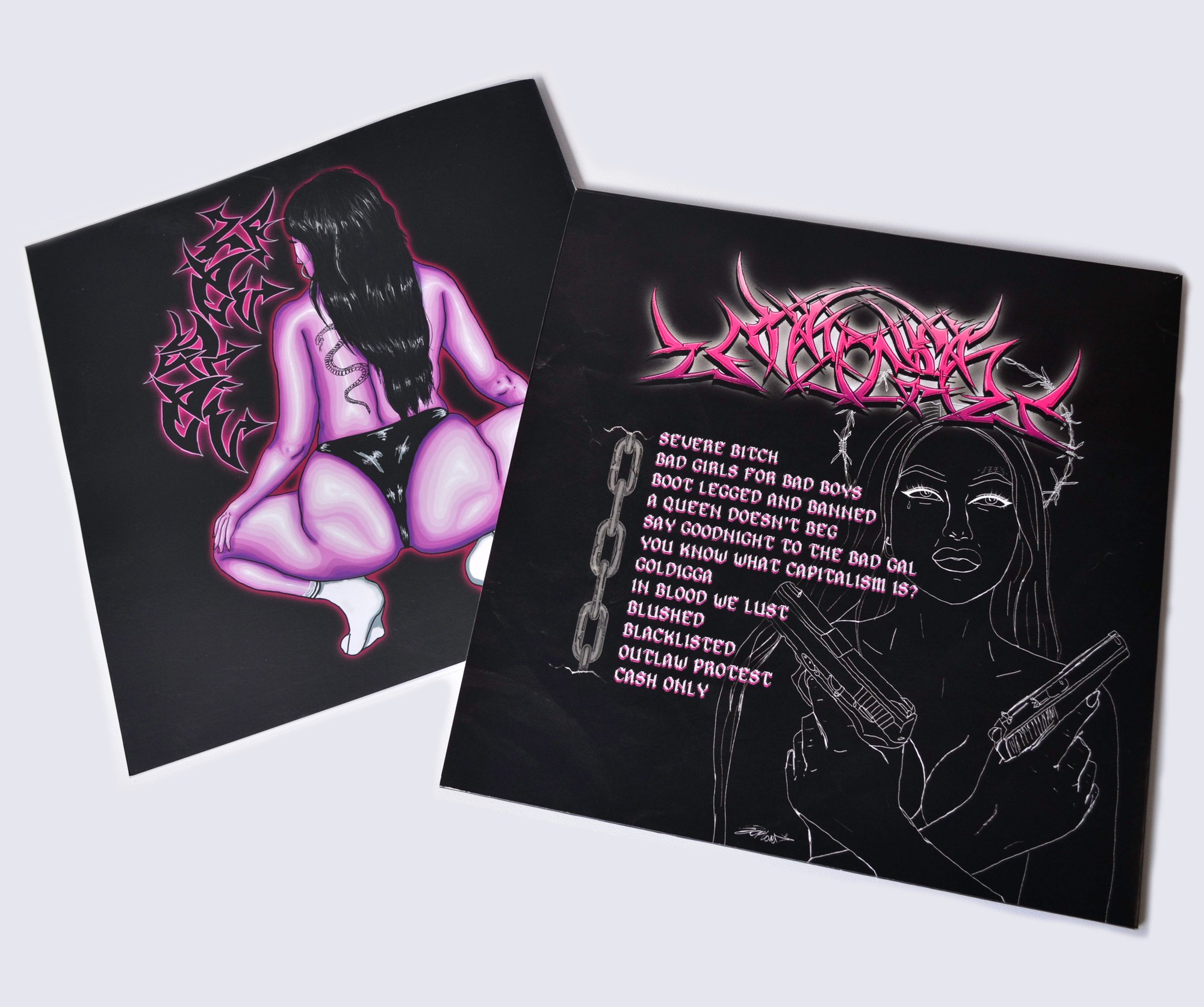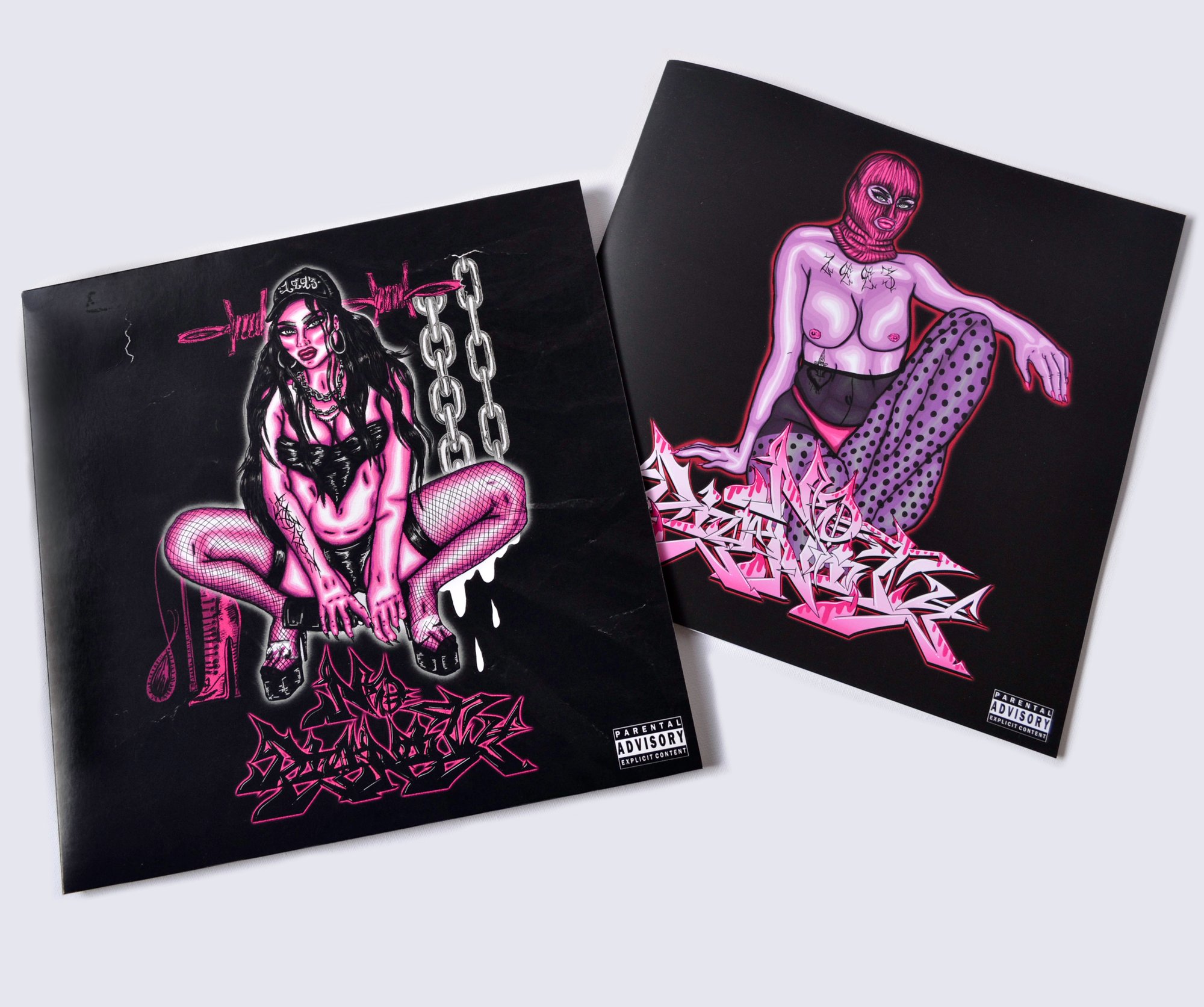 NO DIGNITY mixes inspiration from old school fetish illustrations, album imagery, tattoo art, punk zines, film stills, anti-style graffiti, female hip hop artists, with hints of protest; using collage, spray paint, marker pen and ink, which was then adapted into a digital format.